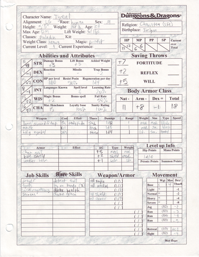 Tyreal was a paladin, back when they had their own set of ridiculous constraints that all DMs dreamed about exploiting. It was as if simply being a paladin were grounds for being punished for the character's entire life. In this case, Matt forced poor Tyreal to deliver longwinded sermons to an apathetic audience. The strain of this feat was too great for Tyreal, and he was forced into early retirement.
