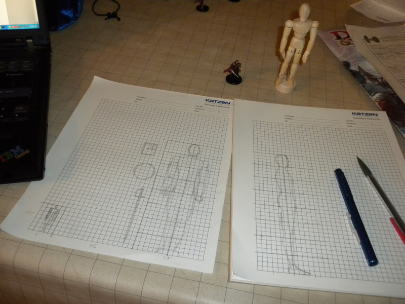 First things first. I'm not an artist. I took art classes in high school and I wasn't that great. It just so happens that the first step of this process is to draw a sketch of your miniature to work off of. Well, hork. I started with the basics - drawing a rough sketch of a vaguely humanoid entity. This was pretty hard, although I expected it to be. It took me about an hour and a half, so not too bad.