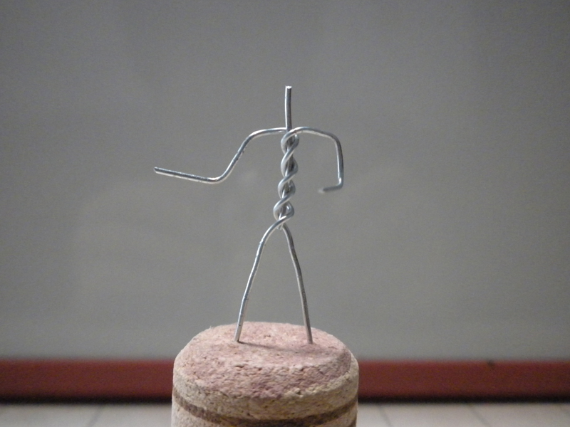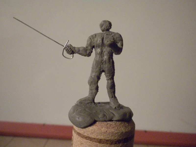 The first step was to create an armature to support the modeling clay. I used floral wire and bent it into shape using pliers. The legs look a little long, but that is because I put the armature into a cork to help support it and so I could use both hands for working on it. I decided to put Zerkos in a fencing pose since that's his fighting style.